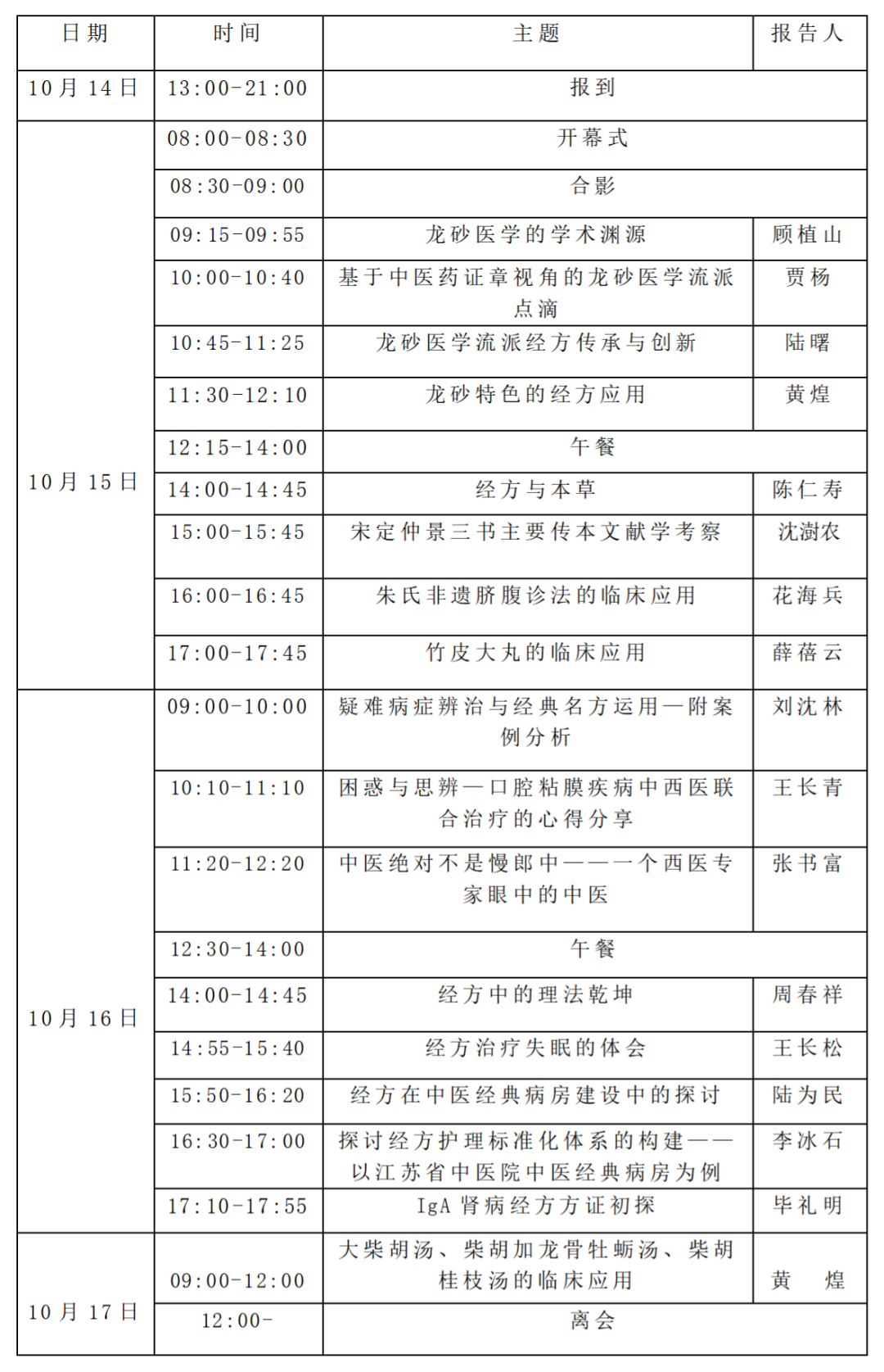 会议内容1.龙砂医学流派学术研讨会; 2.经方临床应用提高班(项目编号:2021021); 3.江苏省中医药学会经方研究专业委员会学术年会(项目编号:ZH2021039)。